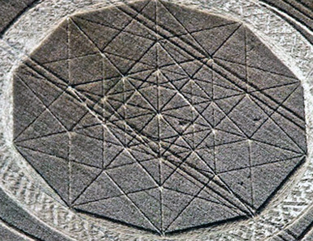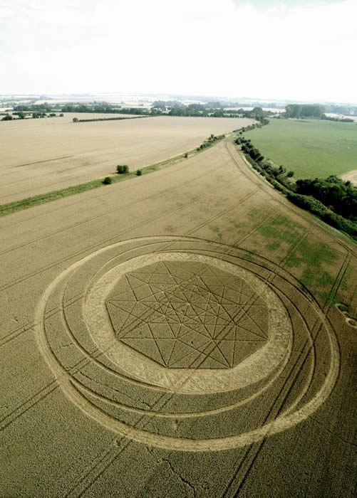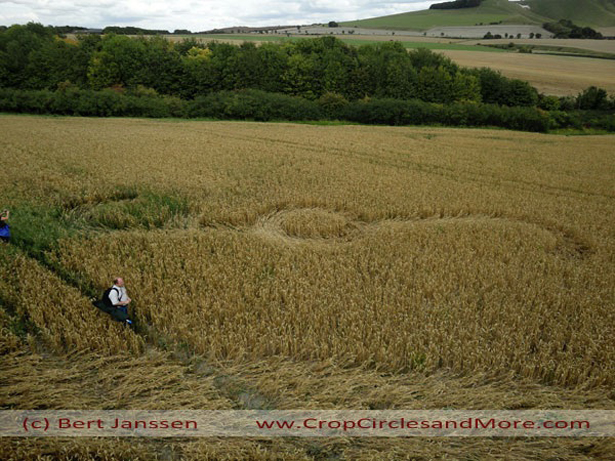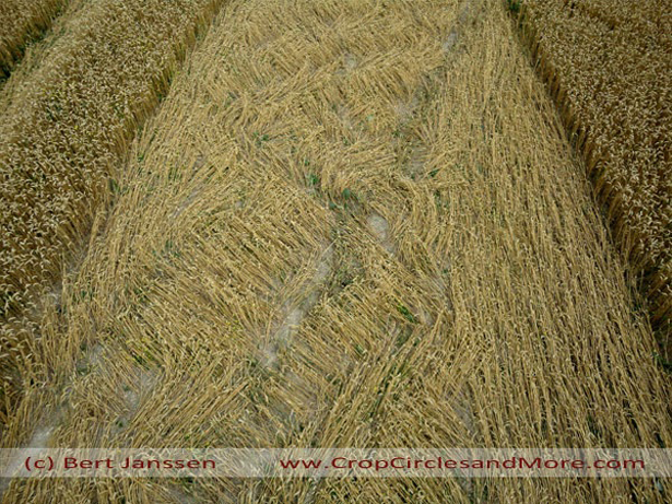 The Cherhill farmer described this event as "vandalism". He is preparing this field for imminent harvest and does not want anyone to enter his field under any circumstances. Please respect his wishes. After having a good look over the circle we would tend to agree with the farmer's assessment, that the circle was mechanical constructed leaving a clear systematic process well evident. The green patch near the circle is (probably) the result of fertilizer spray missing that area, leaving that patch of wheat stunted in its growth.